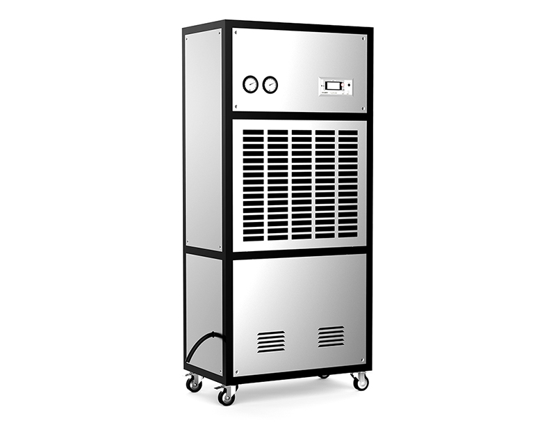 工业用除湿机通过风机将潮湿空气抽入机器内部,通过压缩机制冷将蒸发器降温至露点以下,潮湿空气经过蒸发器在表面凝结成水,汇集至接水盘后,流入水箱中,干爽空气经冷凝器重新加热由出风口排出,这样不断循环将室内湿度降低