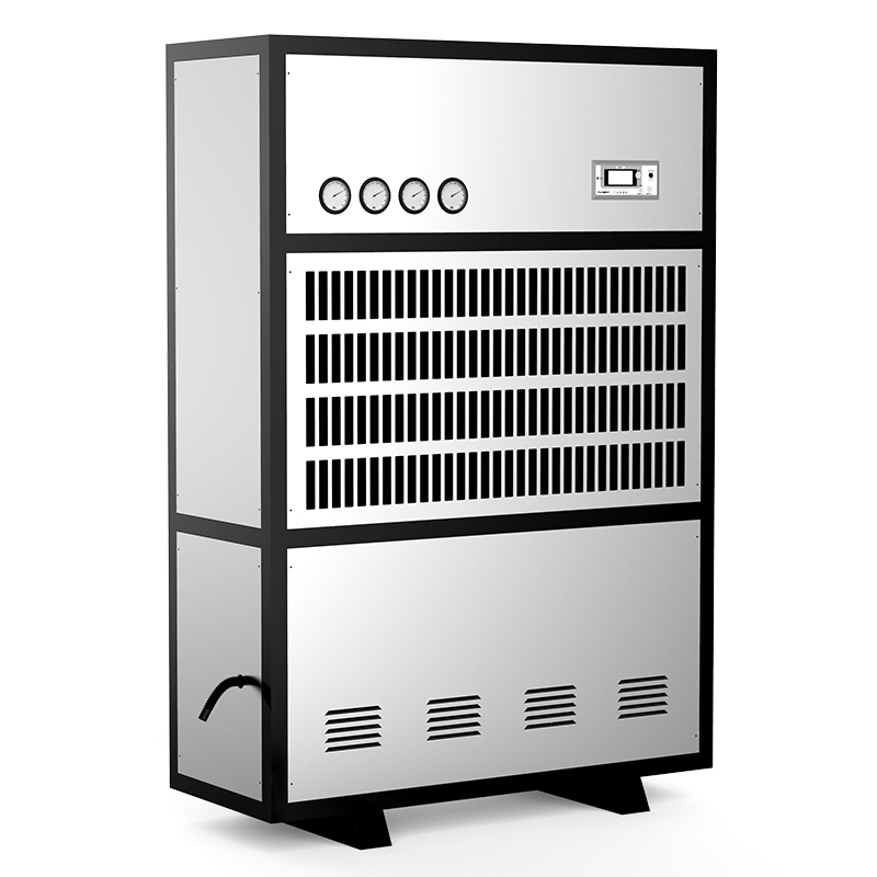 工业用除湿机通过风机将潮湿空气抽入机器内部,通过压缩机制冷将蒸发器降温至露点以下,潮湿空气经过蒸发器在表面凝结成水,汇集至接水盘后,流入水箱中,干爽空气经冷凝器重新加热由出风口排出,这样不断循环将室内湿度降低
