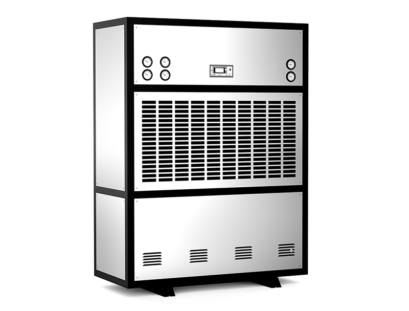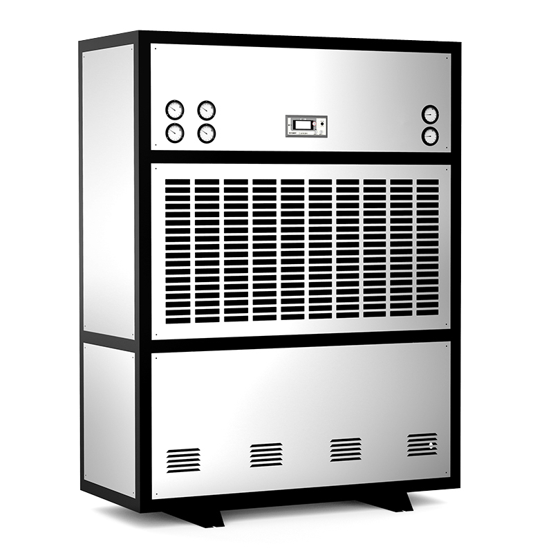 工业用除湿机通过风机将潮湿空气抽入机器内部,通过压缩机制冷将蒸发器降温至露点以下,潮湿空气经过蒸发器在表面凝结成水,汇集至接水盘后,流入水箱中,干爽空气经冷凝器重新加热由出风口排出,这样不断循环将室内湿度降低