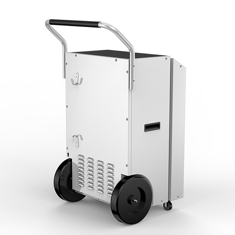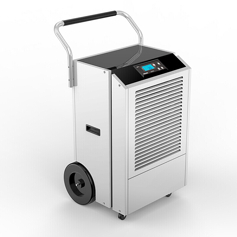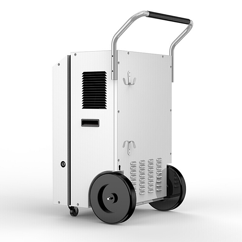 工业用除湿机通过风机将潮湿空气抽入机器内部,通过压缩机制冷将蒸发器降温至露点以下,潮湿空气经过蒸发器在表面凝结成水,汇集至接水盘后,流入水箱中,干爽空气经冷凝器重新加热由出风口排出,这样不断循环将室内湿度降低